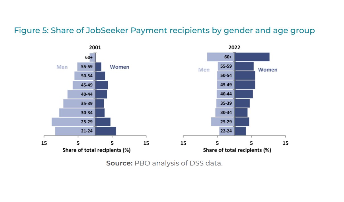 Women over 55 made up the largest proportion of JobSeeker recipients last year at 16 per cent, according to an analysis of Department of Social Services data by the Parliamentary Budget Office.