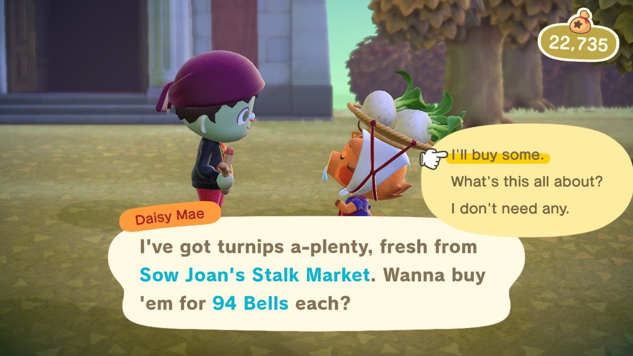 For those who may have forgotten the basics, Daisy Mae is a New Horizons NPC who comes to your village between 5 a.m. and 12 p.m. every Sunday. She sells you bundles of 10 turnips for a price between 90-110 Bells each. If you’ve made it far enough into the game to unlock cooking, then you’ve likely played the Stalk Market at least once before. Just like the real stock market, the goal is to buy turnip bundles at a low price and then sell them for a higher price at Nook’s Cranny between Monday and the following Saturday at 10 p.m. on your own island or another island with a high sell price.