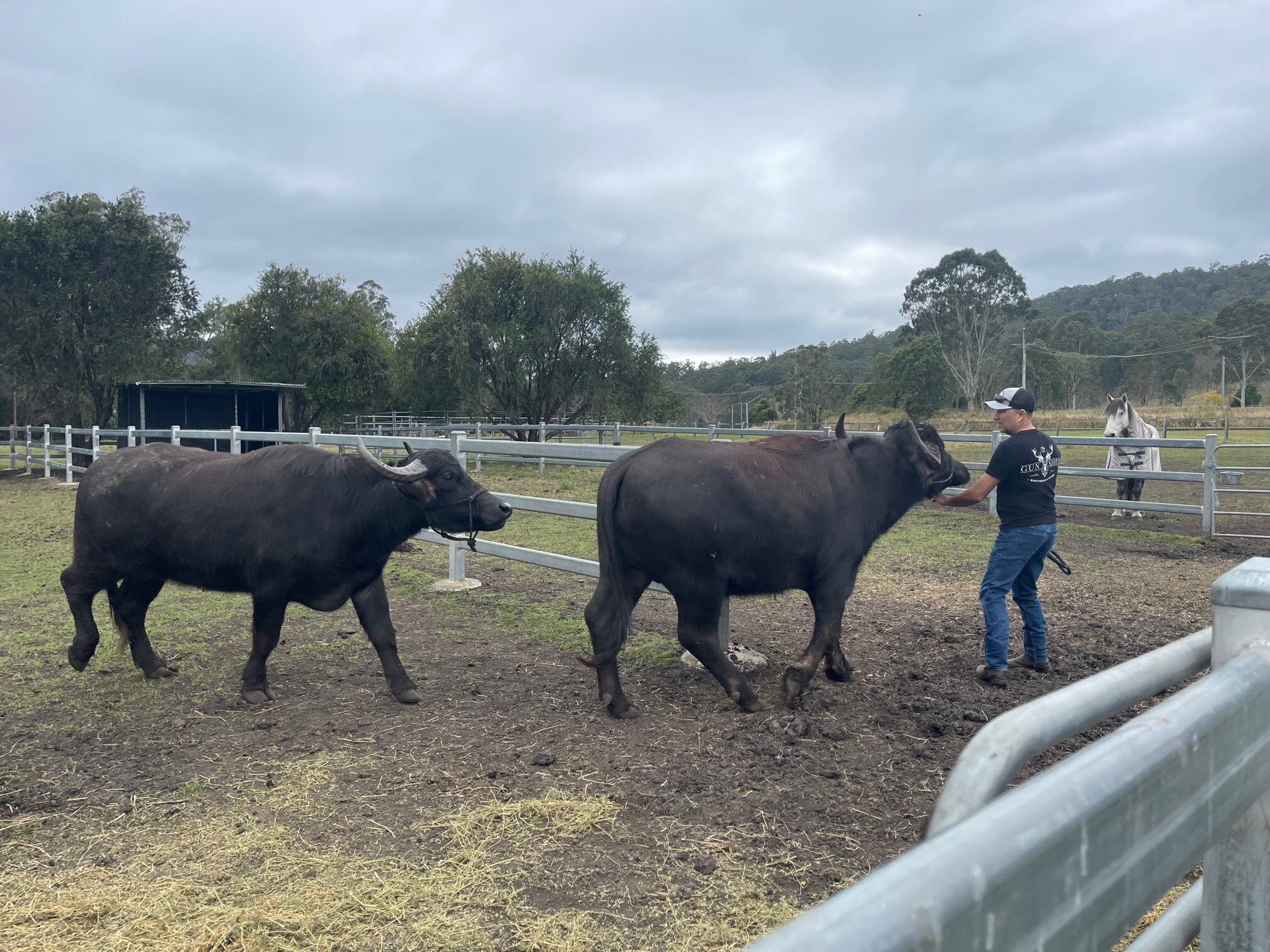 Buffaloes Bert and Ernie have become a common sight in Canungra as Mr Noy trains them to be part of his daughter's trick riding business which performs at country shows.