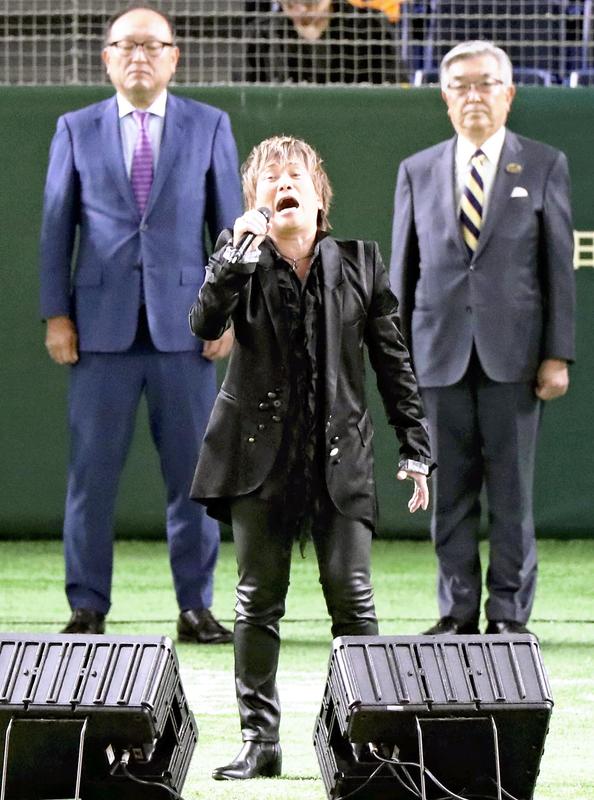 Anison (anime song) singer Hironobu Kageyama sang the national anthem before the start of Game 3 of the Japan Series between the Yomiuri Giants and the Fukuoka SoftBank Hawks on Oct. 22 at Tokyo Dome.