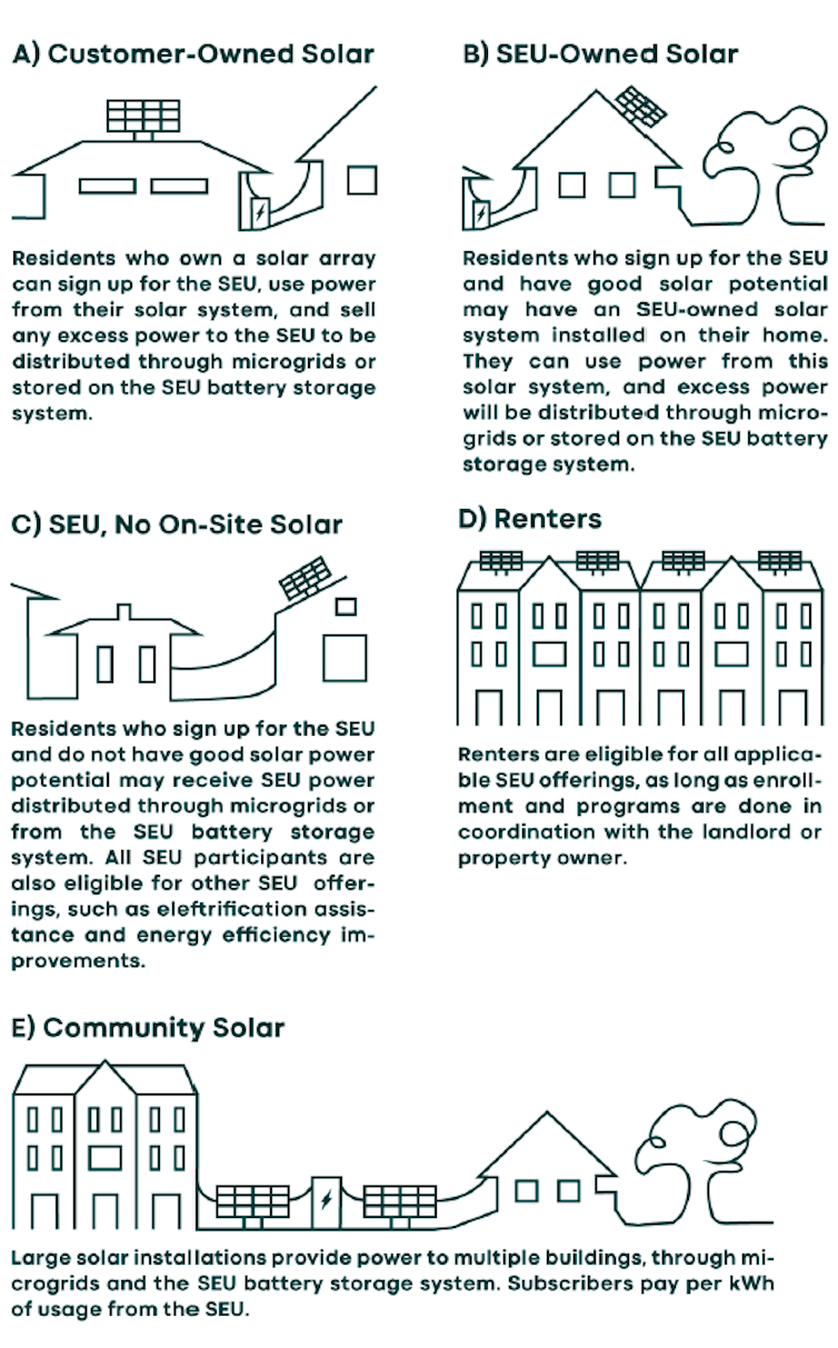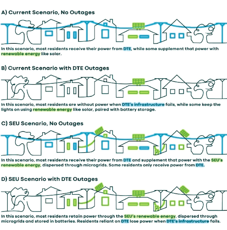 First, an SEU can function at almost any scale. A city like Ann Arbor can provide energy and services directly to homes and businesses that opt in and build out new distribution lines with each microgrid or community solar project. Only the residents who opt in pay for the service, allowing it to expand as more homes join.