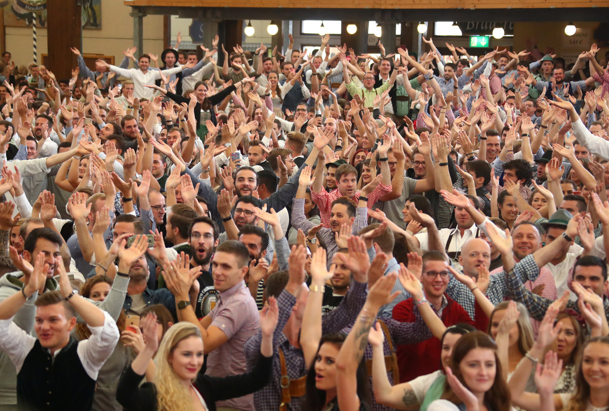 Visitors cheer during the opening day of the 185th Oktoberfest in Munich, Germany September 22, 2018. REUTERS/Michael Dalder