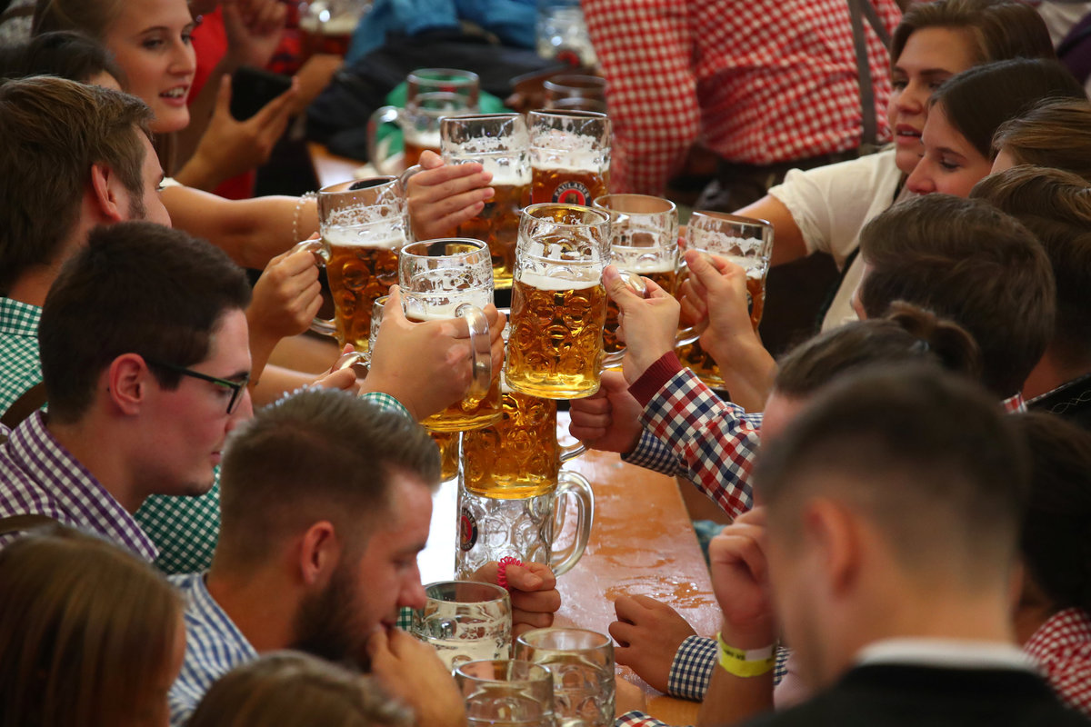 Visitors cheer with beers during the opening day of the 185th Oktoberfest in Munich, Germany September 22, 2018. REUTERS/Andreas Gebert