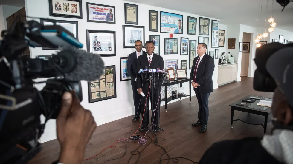 Wilson spoke to reporters inside his 49th-floor Loop condominium, overlooking Lake Michigan. He was joined with former Cook County Commissioner Richard Boykin.