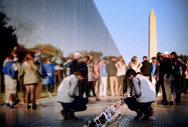 They see themselves reflected, against the roll of the dead, on the black granite walls of Maya Lin's Vietnam Veterans Memorial in Washington, or in the faces of Frederick Hart's evocative sculpture of three soldiers nearby.