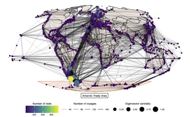 Most voyages reach Antarctica via one of the five recognised gateway cities – Punta Arenas (Chile) and Ushuaia (Argentina) in South America, Hobart (Australia), Christchurch (New Zealand), and Cape Town (South Africa). However, our study found that an extra 53 places acted as departure ports.