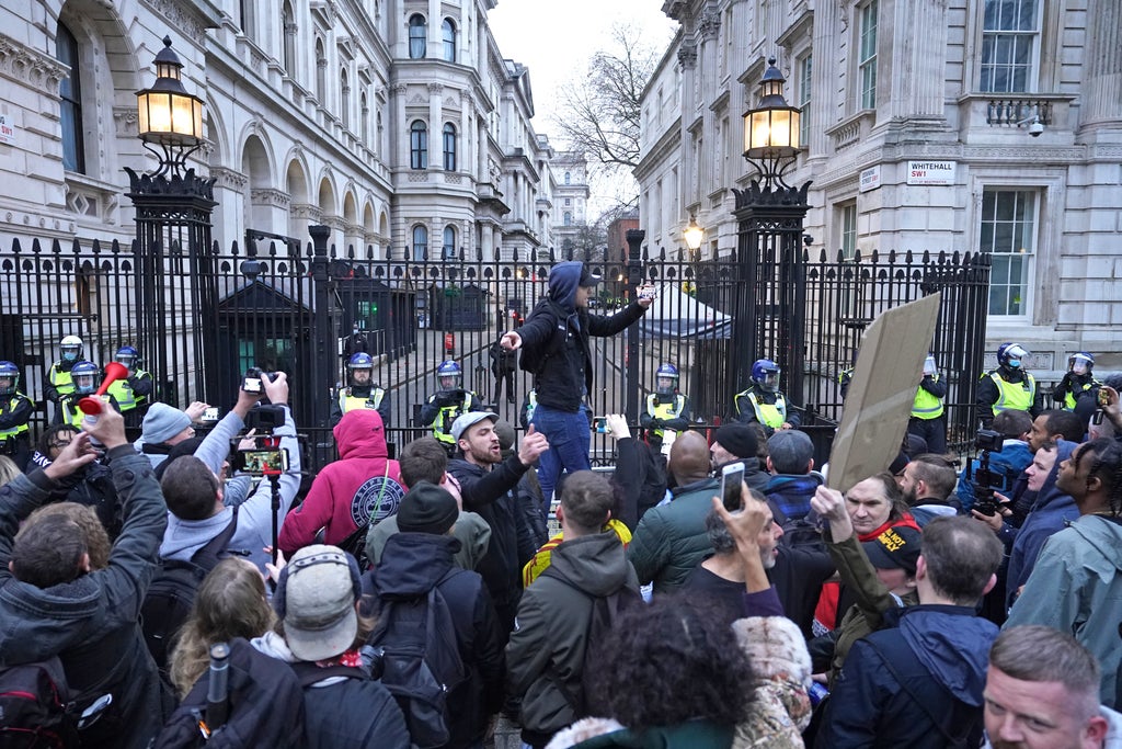 One video posted to Twitter showed protesters breaking down a barrier as police hit protesters with a baton near Downing Street.