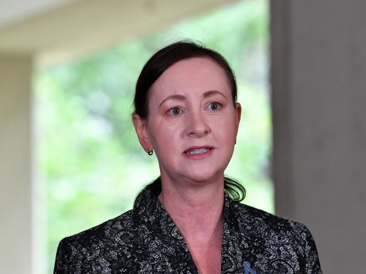 Yvette D'Ath was speaking to media at the Cairns Esplanade as part of a vaccination drive in the far north of the state when a woman dressed in white with a large sunhat interrupted.