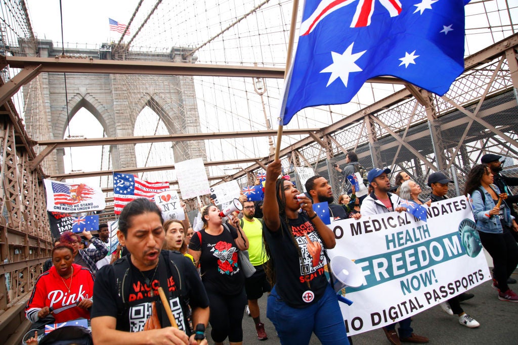 Crowds held placards outside the Department of Education (DOE) offices in Brooklyn before moving towards the Australian Consulate; Australia has also seen numerous anti-vaxx protests in recent days after a number of vaccine mandates.