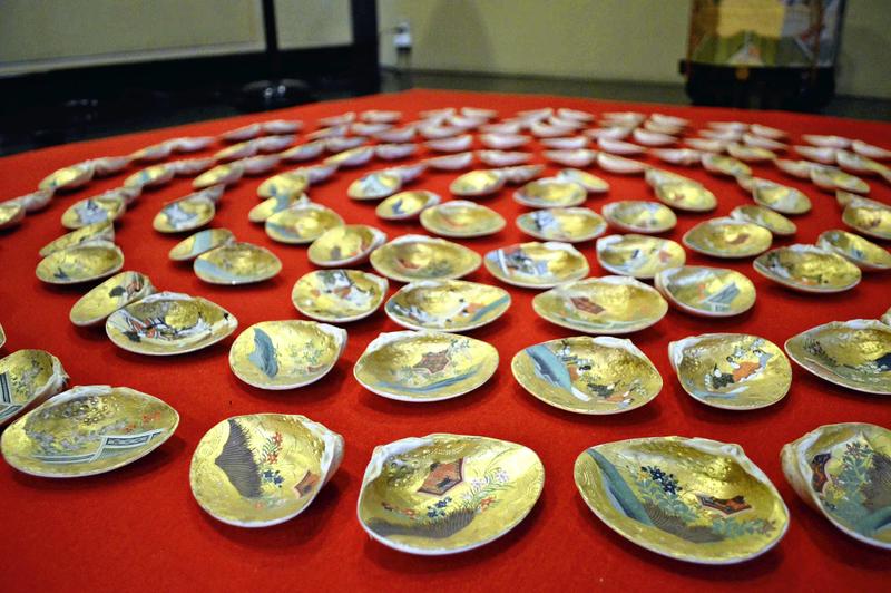 Antique gold-leafed seashells adorned with intricate paintings are seen at Japanese confectioner Taneya Co.'s store in Hikone, Shiga Prefecture. The about 100 shells are believed to have been made sometime between the 13th century and the late 16th century. They were used in a game that originated in the Heian period (late eighth to late 12th century) called kai-awase, in which players look for matching shell pairs. Some of the images on the shells feature episodes from the Japanese literary epic "The Tale of Genji." The shells will be on display through March 23.