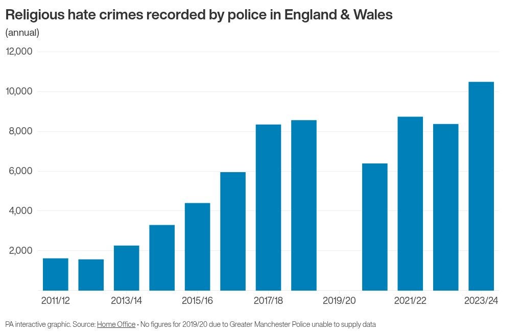 Data for the year ending March 2024 shows a 25 per cent rise in religious hate crimes compared to the preceding 12 months.