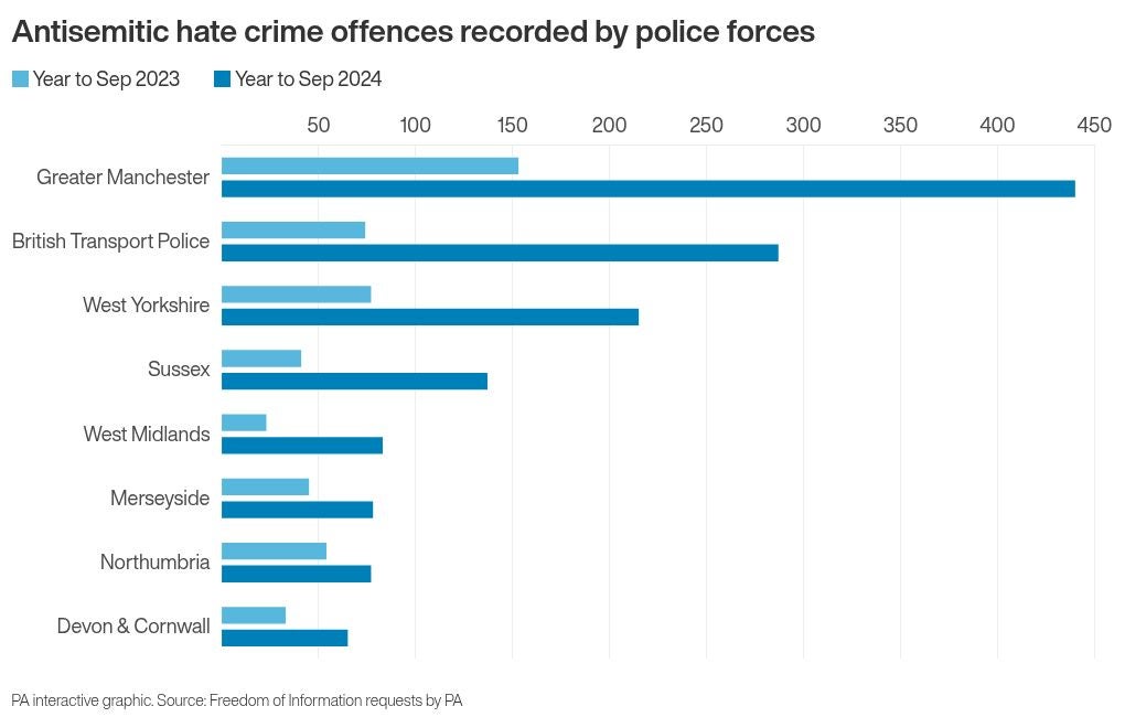 More recent figures obtained by the PA news agency through Freedom of Information requests show many of the largest police forces in the UK saw sharp jumps in antisemitic offences in the year following the start of the Hamas-Israel conflict in October 2023.