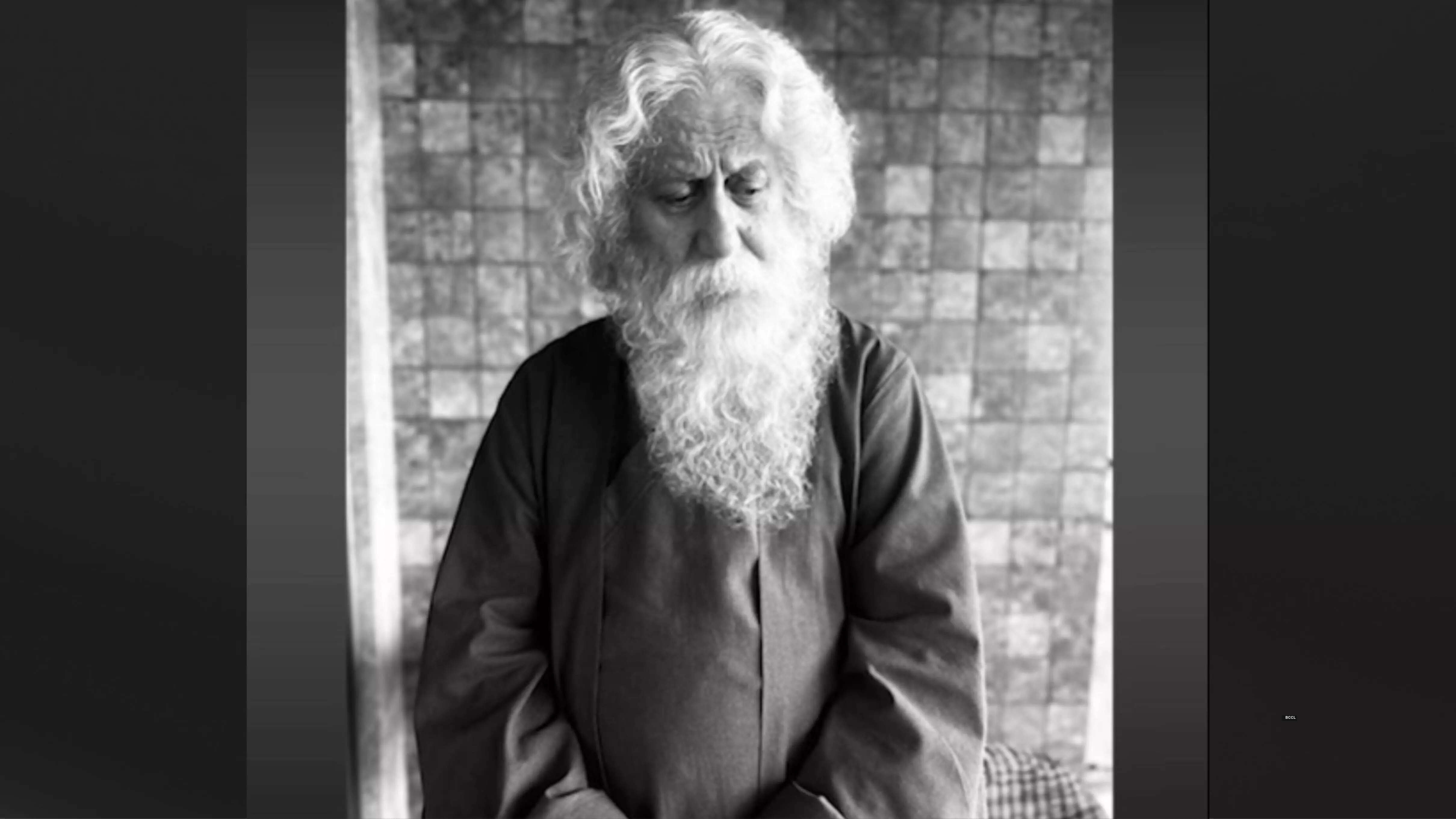 In the captivating black and white photo, Anupam can be seen dressed in attire reminiscent of Rabindranath Tagore's signature style. Sporting white hair and a long beard, he dons a serious expression as he gazes towards the floor.