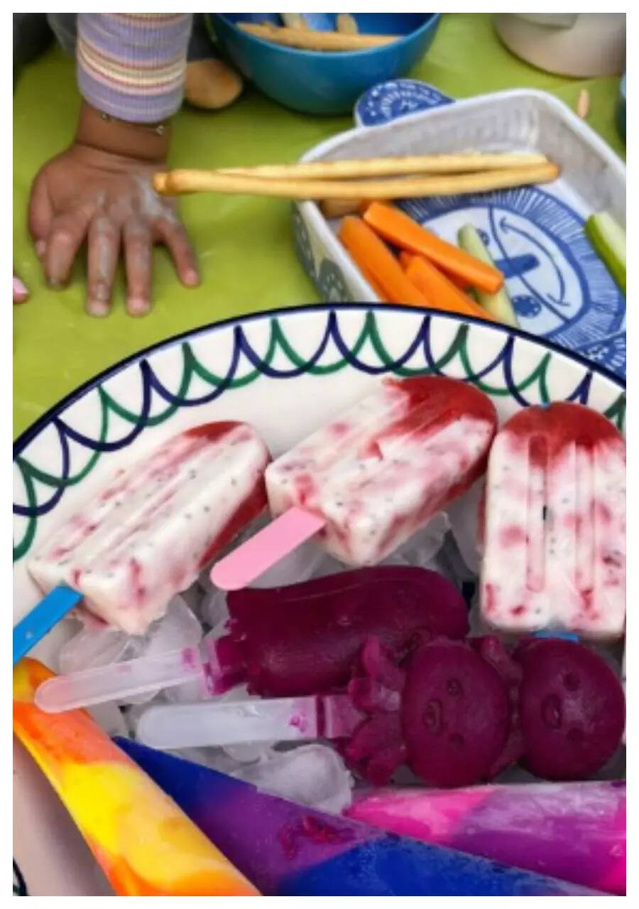 The actress, who has been in the UK, enjoying some private time with the kids while hubby Virat Kohli is away on his tournament, took to her handle to share a photo from her little picnic with the kids. While the picture does not reveal the face of the little one, it does feature two chubby hands reaching for the colourful popsicles and ice creams laid out in a bowl.