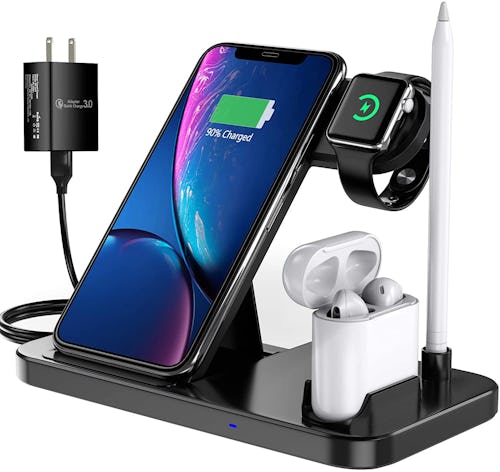 Power up all your devices in one place with this wireless charging station. The Qi-enabled station has a platform for your phone, a hook for your smartwatch, and slots for AirPods and a stylus pen, and you don't even have to plug in to charge.