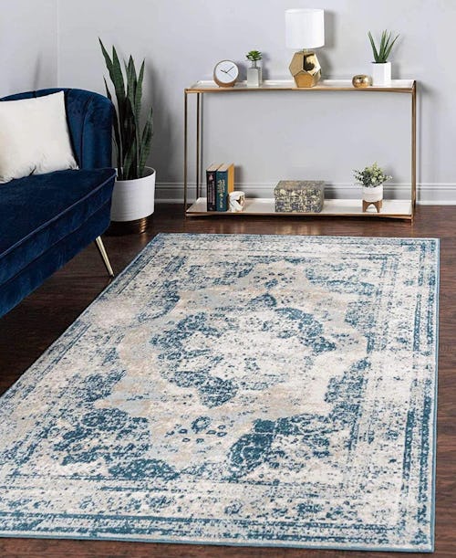 With a traditional French-inspired design, this area rug delivers elegant texture to any setting, and the purposeful fading gives it a cozy, well-worn look. It's available in a range of shapes and sizes, and you can also opt for different shades, like burgundy, beige, and dark brown. The rug is machine-loomed to last and is both stain-resistant and easy to clean.