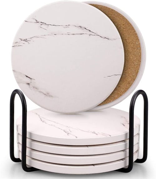 Protect your coffee and kitchen table from rings and watermarks with these ceramic coasters. The ceramic surface absorbs any condensation or heat, and the cork backing keeps them firmly in place. Plus, the included holder corrals them all and keeps them in one place.