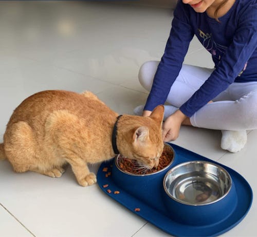 This sleek pet meal station on an easy-to-clean mat