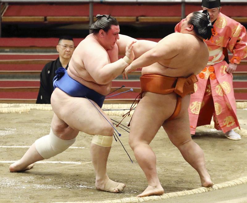 Aoiyama maneuvered his opponent near the bales, but Mitakeumi escaped momentarily before the 193-kilogram Aoiyama, who takes on No. 9 maegashira Takanosho on Friday, stalked him and pushed him out.