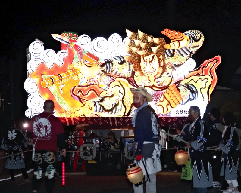 The 4-meter high nebuta float was made by the local Ominato Shincho Neighborhood Association this summer. Families enjoyed taking photos of the illuminated nebuta float as it paraded through the streets of the town accompanied by exciting music from the nebuta hayashi bands.