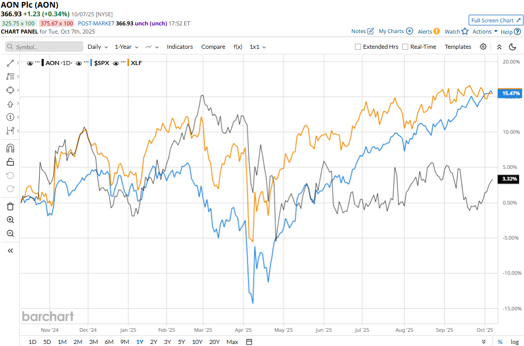 Aon’s stock prices have gained 6.7% over the past 52 weeks, notably lagging behind the Financial Select Sector SPDR Fund’s (XLF) 19.3% surge and the S&P 500 Index’s ($SPX) 17.9% gains during the same time frame.