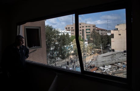 ISRAEL-PALESTINIANS — Israel carried out a wave of airstrikes on what it said were militant targets in Gaza, leveling a six-story building, and militants fired dozens of rockets into Israel on Tuesday. Palestinians across the region observed a general strike as the war, now in its second week, showed no signs of abating. The strikes toppled a building that housed libraries and educational centers belonging to the Islamic University, leaving behind a massive mound of rebar and concrete slabs. Desks, office chairs, books and computer wires could be seen in the debris. Residents sifted through the rubble, searching for their belongings. By Fares Akram and Joseph Krauss. SENT: 1,040 words, photos.