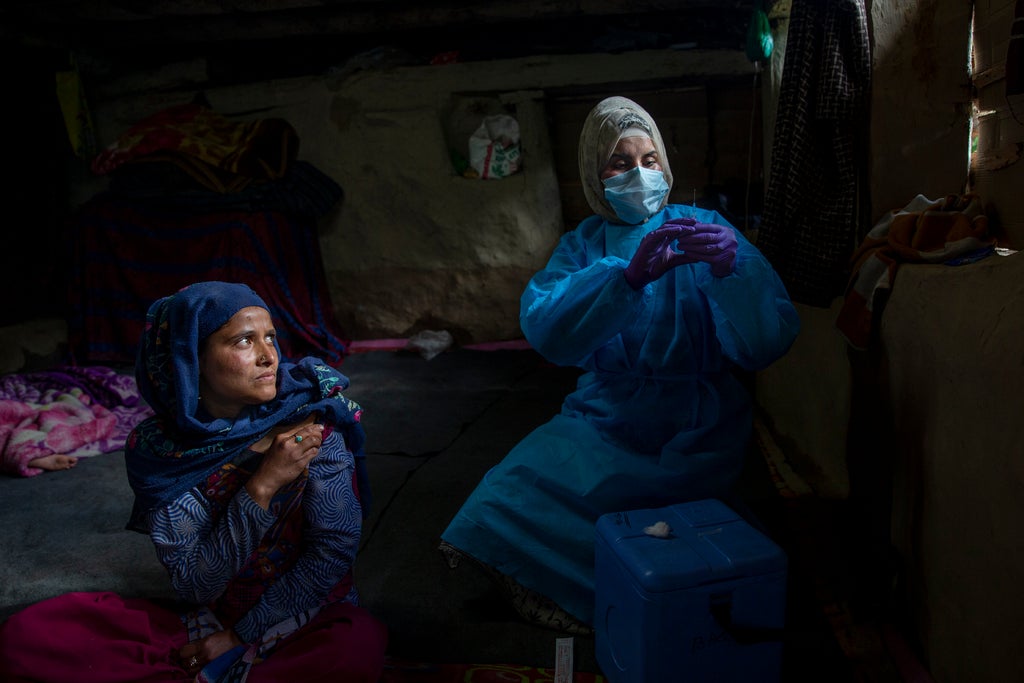 In 2021, a glimmer of hope arrived with COVID-19 vaccines. Overcoming fears about them was almost as hard as the trek to get the doses out. A healthcare worker dedicated to vaccinating shepherds and nomadic herders in Indian-controlled Kashmir succeeds in vaccinating a woman inside a hut. Virtual reality goggles distract an 8-year-old boy in Israel as he gets the jab, which was finally approved for children ages 5-11.
