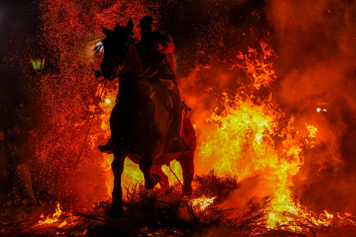 It’s a centuries-old tradition in the Spanish village about 100 kilometers (60 miles) northwest of Madrid that takes place every year to honor St. Anthony the Abbott, the patron saint of animals. Riders guide horses through bonfires lit in the middle of the street in an act believed to purify the animals in the coming year.
