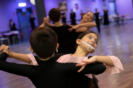 In the huge hall with mirrors on the walls and multi-colored lights, couples wear masks during warm-ups and pauses but are allowed to remove them while performing traditional ballroom or Latin dances. Most keep them on anyway.