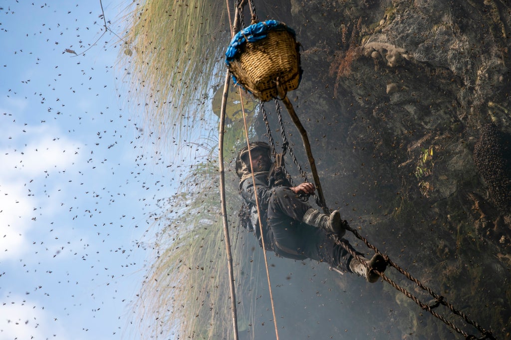 High up in Nepal's mountains, groups of men risk their lives to harvest much sought-after wild honey from hives on cliffs.