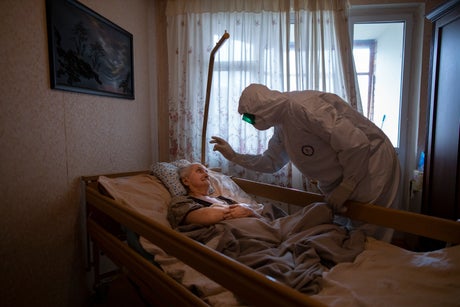 “It’s both very intimate and deeply symbolic,” he said of his photo of the priest bending over an elderly COVID-19 patient in Moscow, “an image of empathy and self-denial in the face of mortal danger.”
