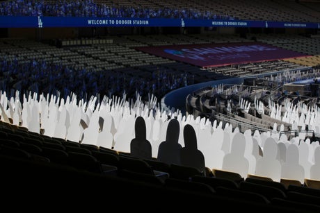 Throughout the past year, as the games and events have happened, photographers from The Associated Press were there, capturing the images that few could have imagined in the days before the pandemic began dominating the global conversation. Cardboard cutouts of fans in the stands, instead of actual people there to cheer. Competitors wearing masks. At events where ticketholders were allowed, people being spaced out to allow for social distancing.