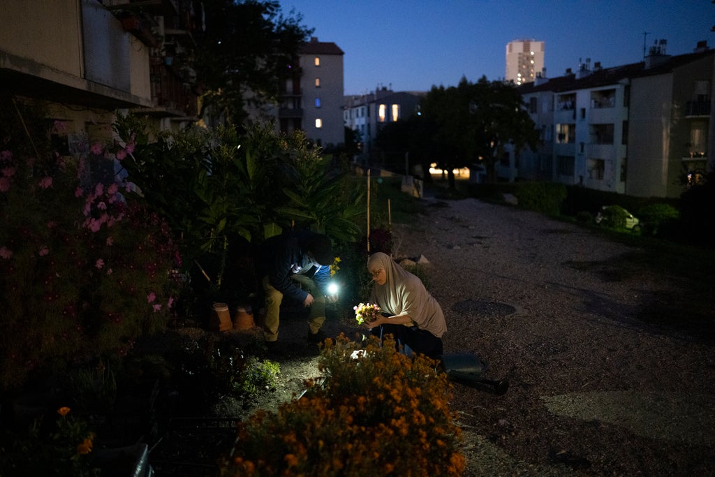 At the nearby Frais Vallon housing project, Houaria Belmaaziz gently plants a pea seed in a small garden shaded from the sun by four enormous residential towers. She repeats the process until her cup of seeds is empty.
