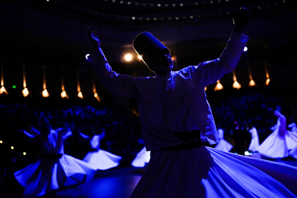 Leaving their cloaks on the ground, they take their places around the circular floor and begin to spin to reach a trance-like state that they believe unites them with God. The ritual is performed to the sound of chanting and music from a reed flute and other instruments.