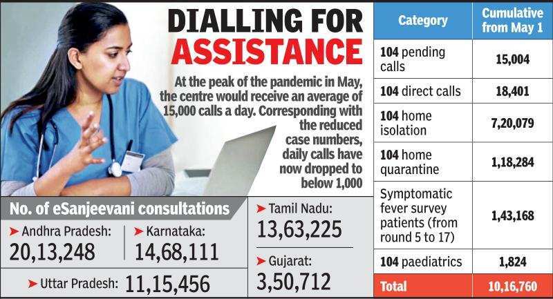 VISAKHAPATNAM: The 104 call centre, the one-stop solution for all Covid-19 related queries and issues in Andhra Pradesh, has crossed the 10-lakh teleconsultation milestone. The revamped centre had started offering Covid-19 services in the second wave from April, while teleconsultation services began in May.