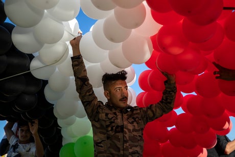 From a supporter of Syrian President Bashar Assad preparing to release hundreds of balloons with the colors of the Syrian flag at a gathering in the Syrian capital of Damascus to demonstrators marching across the Brooklyn Bridge as they remember George Floyd on the one-year anniversary of his death, and an Indian woman separating grain from the husk in a paddy field on the outskirts of Gauhati, India, this photo gallery highlights some of the most compelling images made or published in the past week by The Associated Press from around the world.