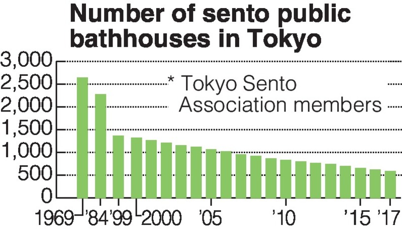 There are fewer public bathhouses in Tokyo due to the spread of bathtubs in homes and the shortage of successors to take over such businesses. The number of public bathhouses belonging to the association saw a postwar peak in 1969 of 2,634, and has since declined to 556, or about one-fifth of the peak, according to the association.