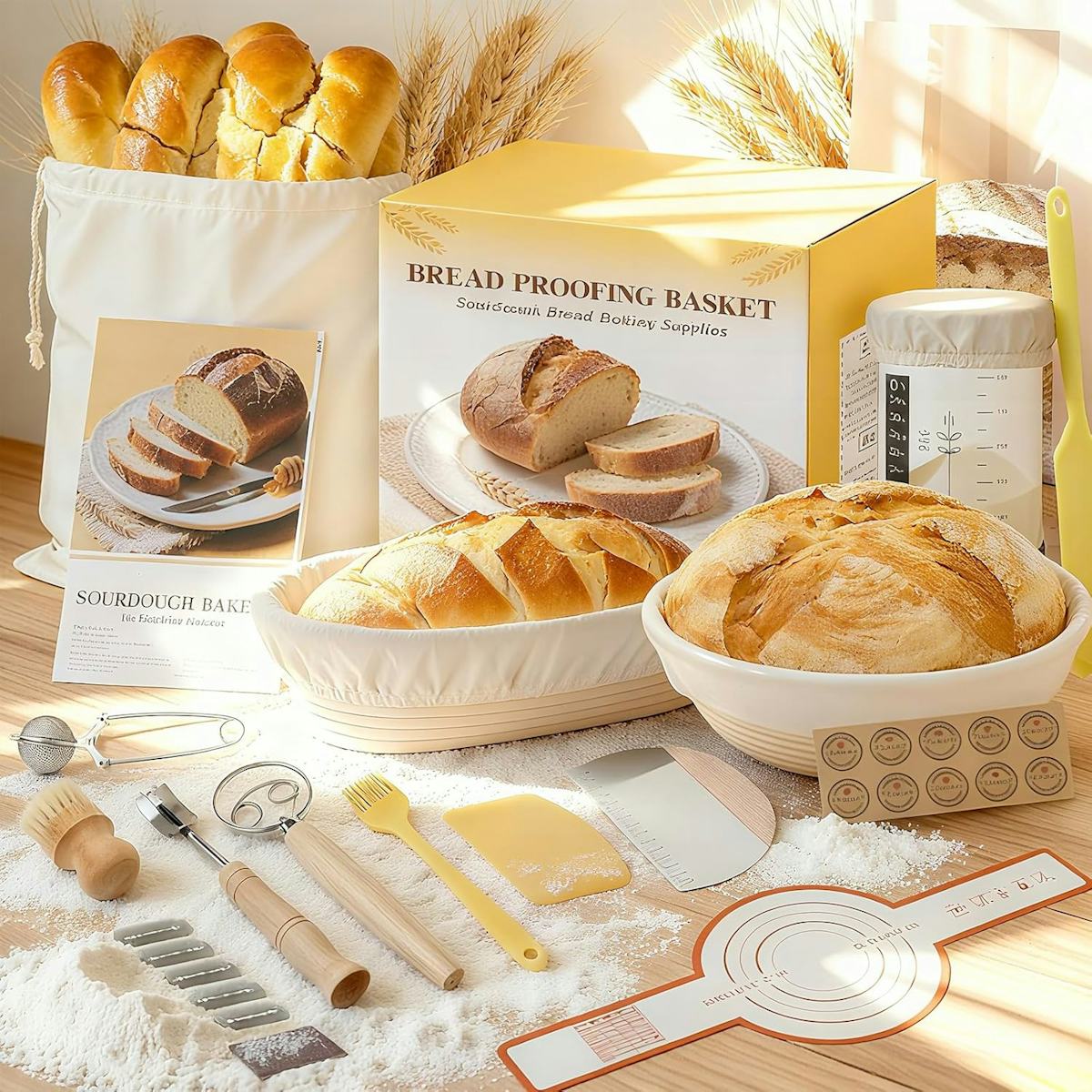 A sourdough starter kit with a dough whisk, scrapers, & more