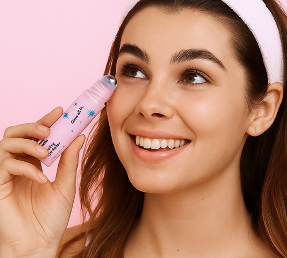 Brightening under-eye balm with a cool roller applicator