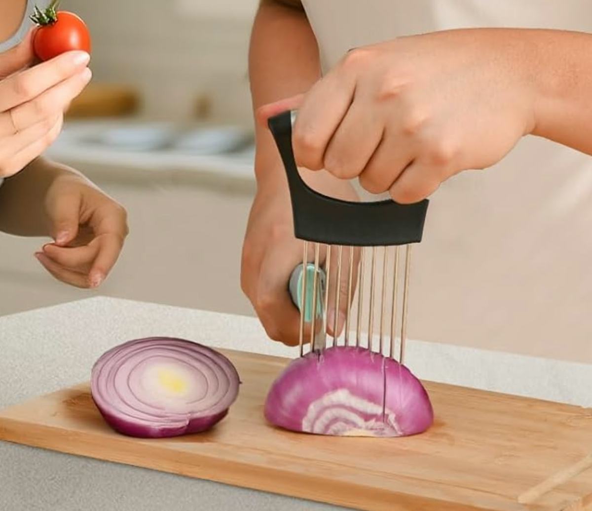 A sturdy holder that helps you evenly chop ingredients