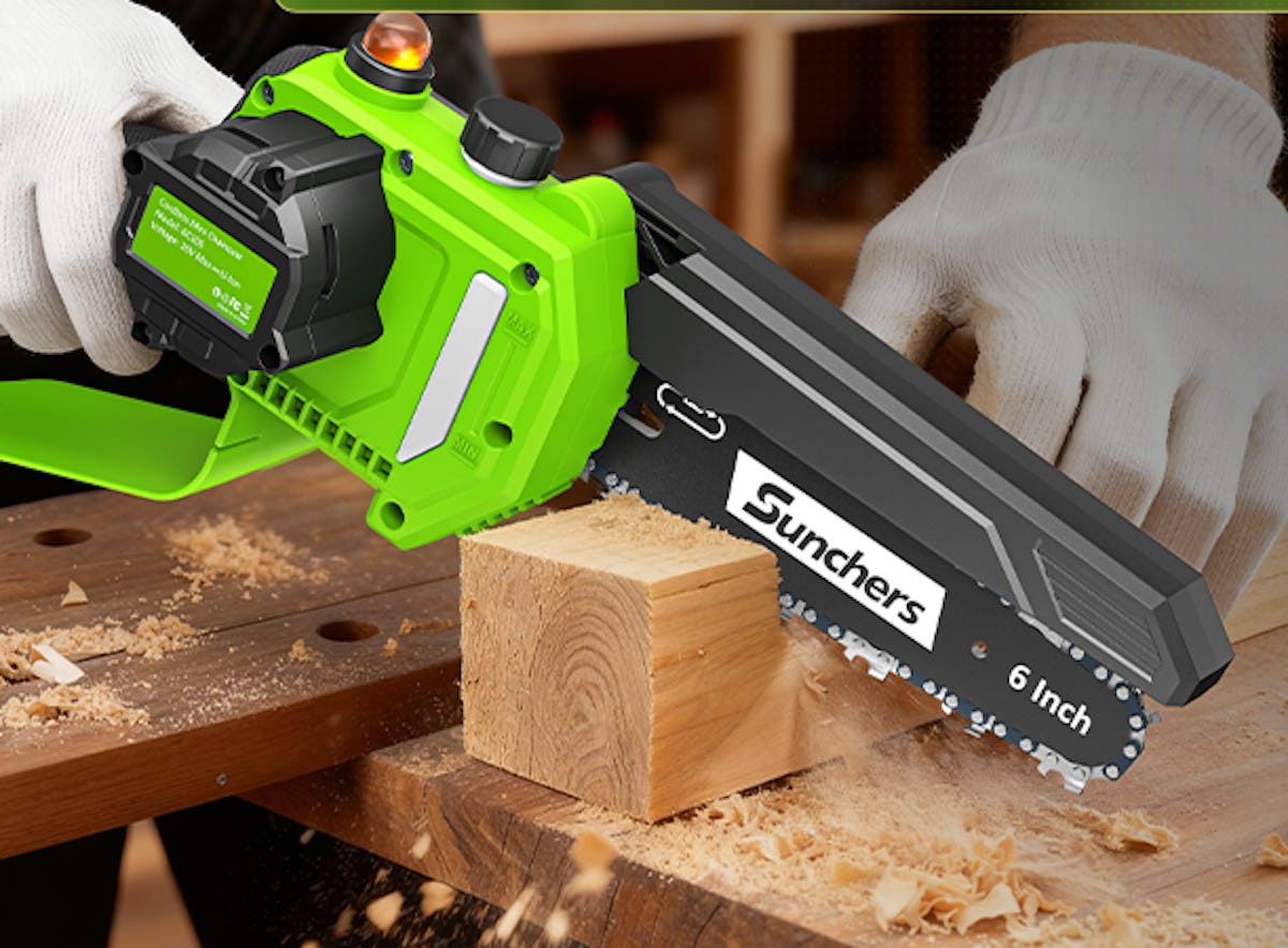 A cordless mini chainsaw with a powerful battery