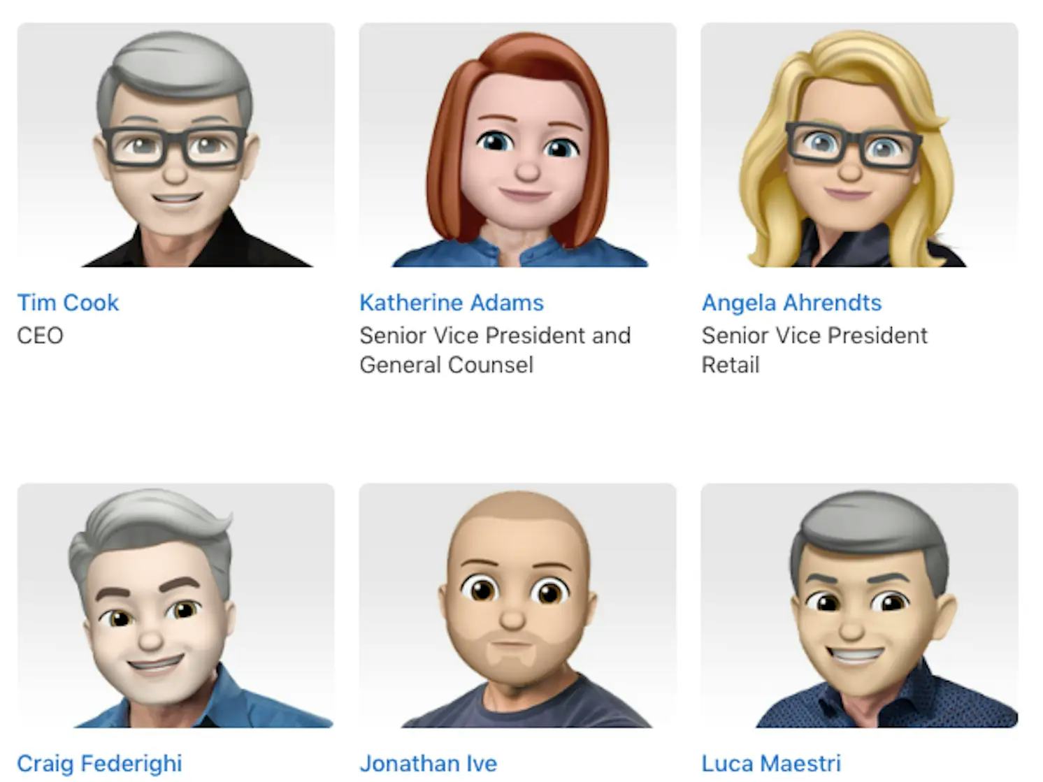 Seriously, though, it's not inconceivable. Back in 2018, as Business Insider reported, Apple temporarily changed all of its executive headshots on its website to Memojis, and it's trotted them out in keynotes before. So we know they're ready to go. Of course, there'll be some notable absences from the list below: both Angela Ahrendts and Jony Ive have since left Apple.