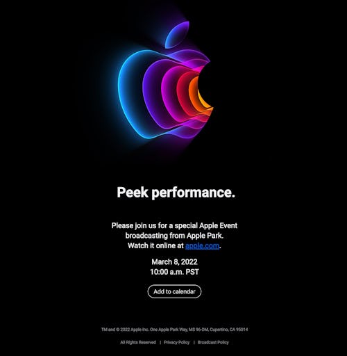 Apple’s first event of 2022 will take place next Tuesday, March 8th at 10 a.m. PT / 1 p.m. ET. The event will be held virtually, viewable on Apple’s website and YouTube, assuming things run as they have previously.