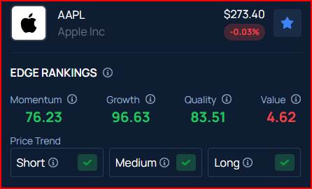 Benzinga's Edge Rankings place Apple in the 76th percentile for momentum and the 83rd percentile for quality, reflecting its strong performance in both areas. Check the detailed report here.