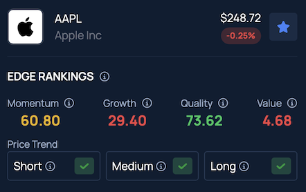According to Benzinga’s Edge Stock Rankings, Apple ranks in the 73rd percentile for Quality, highlighting its consistent performance and strength relative to competitors.