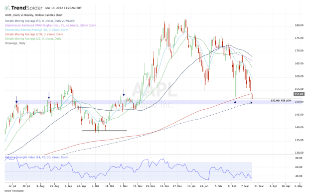 With this morning’s open, Apple undercut the February low at $152, but found its footing between the 200-day and 50-week moving averages and near the $150 area. The $150 zone was resistance in 2021 and is acting as support in 2022. At least so far.