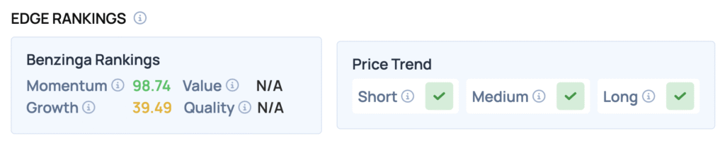 Benzinga Edge Rankings: Underscoring the stock’s powerful upward movement, Benzinga Edge rankings show the stock has an exceptional Momentum score of 98.74 alongside a positive price trend across all timeframes.