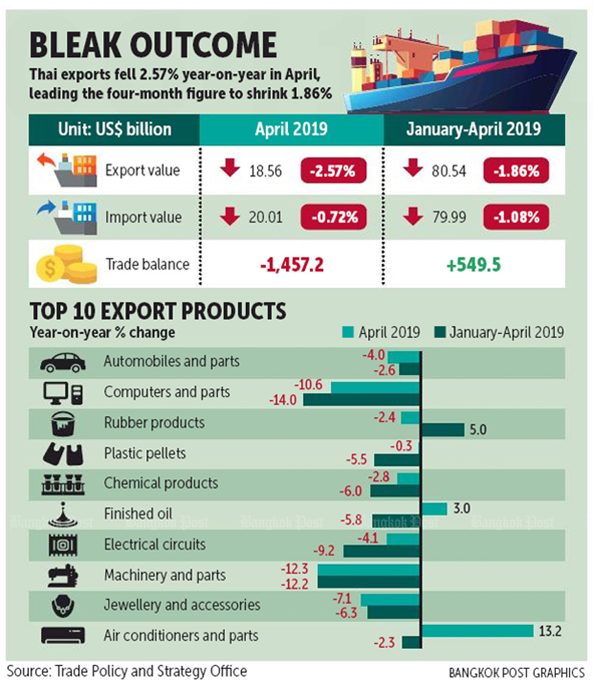 The Commerce Ministry reported on Wednesday that Thailand's customs-cleared exports fell 2.6% year-on-year in April, fetching US$18.6 billion, after a 4.9% decline in March.