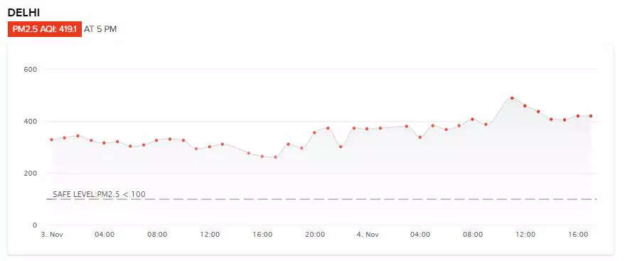 According to the Central Pollution Control Board's data, the capital's 24-hour average air quality index (AQI) stood at 382 on Thursday, up from 314 on Wednesday. It was 303 on Tuesday and 281 on Monday.