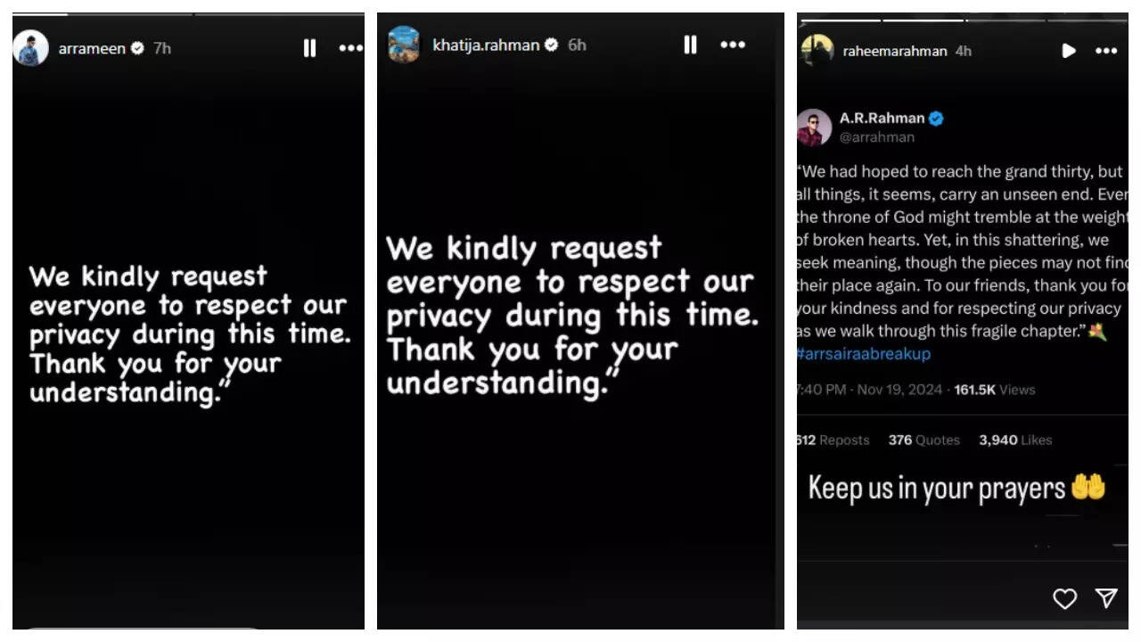 The announcement has drawn support from the couple’s three children. Raheema shared her father's post on Instagram, asking followers to “keep us in your prayers.” She also reposted a Tamil message urging people to respect their privacy, reminding everyone that “it’s their personal issue.”
